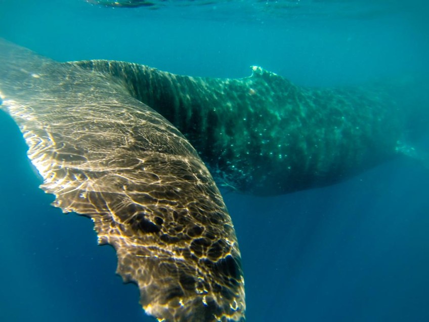 Whales-0181 Published July 5, 2014 at 1024 × 768 in Swimming with the Whales The mother’s tail fluke was close enough to feel the wave of her wake and see the details of the barnacles on her tail flukes