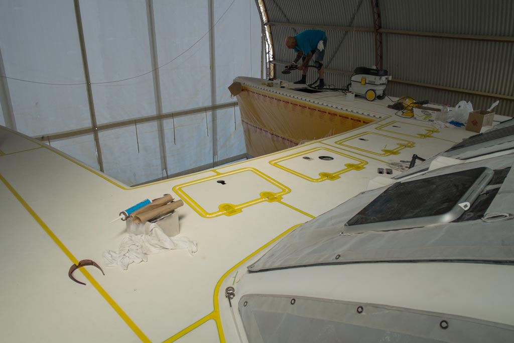 View from the Shed-5395 Published October 17, 2014 at 1024 × 683 in View from the Shed – Part II The foredeck, taped and ready for sanding and painting The foredecks taped up and ready to sand and paint